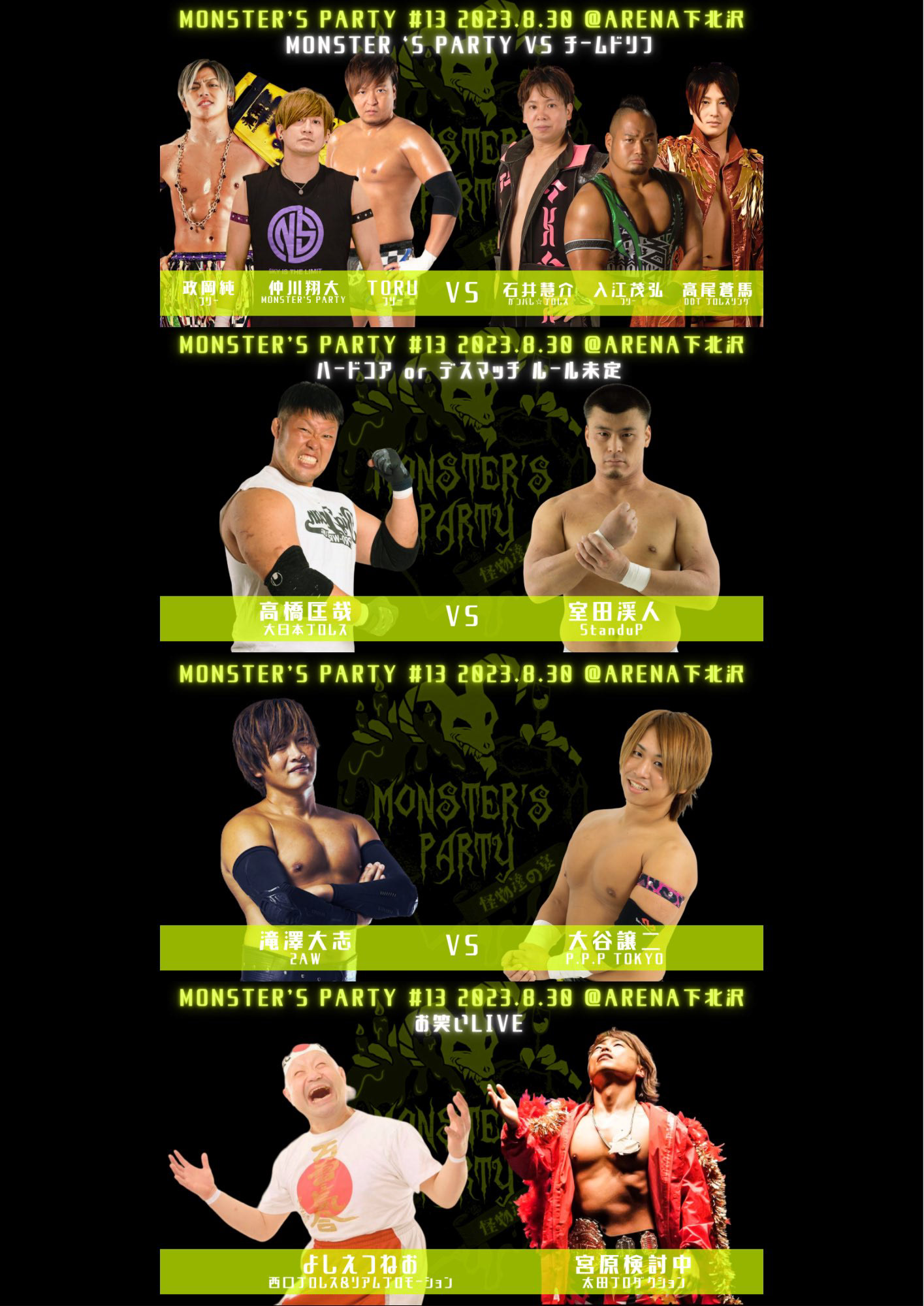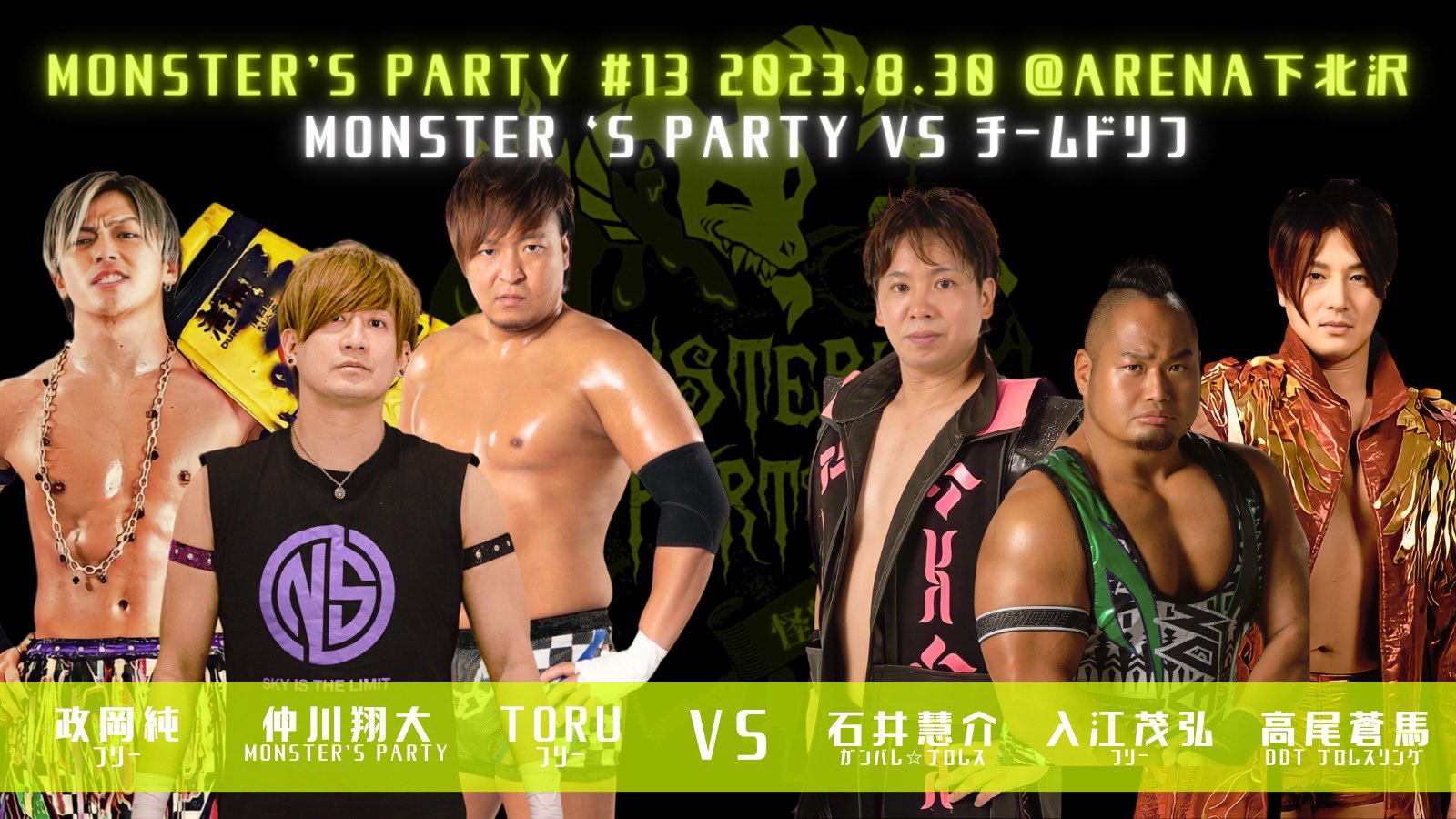 第3試合 仲川翔大 & TORU & 政岡純 vs 入江茂弘 & 石井慧介 & 高尾蒼馬(モンパ vs チームドリフ)